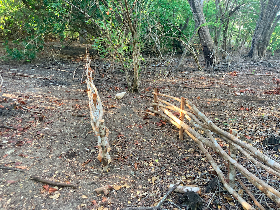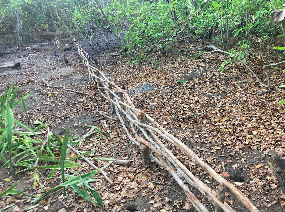 L’artisan, M. José Loudac, vient de terminer la première tranche de 400 mètres et on peut la voir le long du sentier littoral qui relie Grand-Bourg à Folle-Anse juste avant l’usine en venant de la déchèterie. Des gaulettes de merisier agencées en mini-portails de protection dans le sous-bois à hauteur de tortue ont comme poussé sur cette partie du littoral. Telle une frontière destinée à empêcher les tortues de se perdre au-delà. Ces mini-barrières ne sont aucunement là pour limiter l’accès des humains à la plage. D’ailleurs, elles ont des ouvertures réparties tout le long.