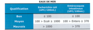 « Il s’agit de germes qui répondent à des tests de contamination fécale : Escherichia Coli et Streptocoques fécaux. Et les valeurs pour classement ponctuel (bon moyen mauvais ) et classement annuel européen ( insuffisant satisfaisant bon excellent ) sont calculés sur les 4 dernières années ».