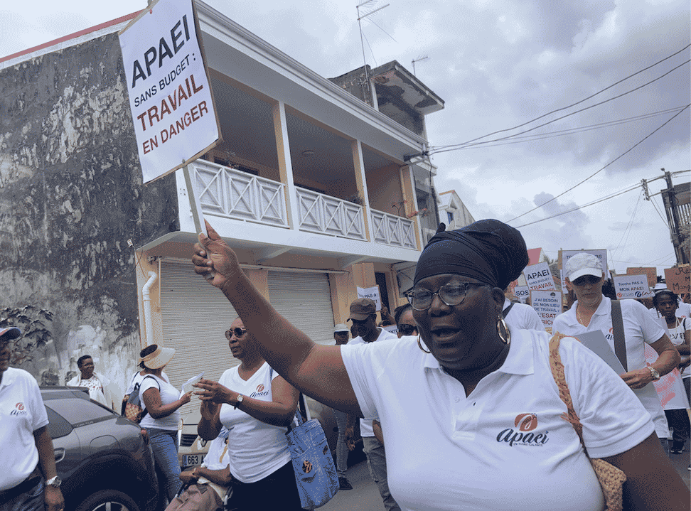 « San agréman, mi dézagréman » ou bien encore «L’APAEI sé tan nou, sé pa ta yo » résonnaient dans les rues de Grand-Bourg ce mardi 14 juin. Plus de 300 personnes ont défilé en soutien à l’APAEI, l’Association des Parents et Amis des Enfants Inadaptés de Marie-Galante. Derrière cette appellation que tout le monde ici connaît, ce n’est pas une petite association mais bien une grosse machine de l’économie locale qui emploie en tout 250 personnes qui est désignée. C’est le premier employeur privé de Marie-Galante devançant l’usine de Grand-Anse. Il se dit communément ici que chaque Marie-Galantais a au moins un proche qui y travaille. L’APAEI gère des établissements médico-sociaux mais aussi des boutiques, des restaurants, une boulangerie… Un système bien huilé qui fonctionne depuis 18 ans et emploie nombre de travailleurs en situation de handicaps dont il permet l’insertion par le travail. L’association revendique injecter pour 8 millions d’euros dans l’économie de Marie-Galante chaque année.