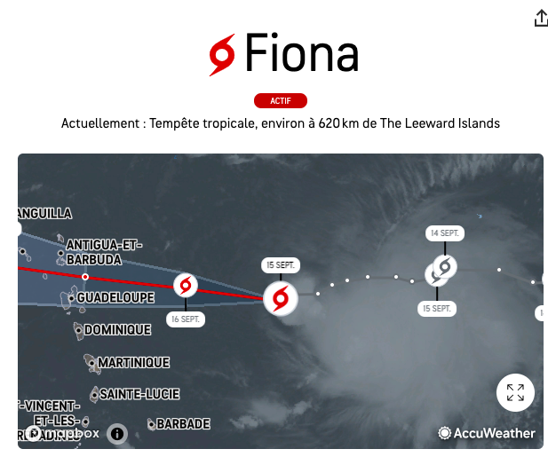 Il n’en reste pas moins que certains sites internet sont de vraies fenêtres sur la météo aussi accessibles que de regarder au-dessus de sa tête. En suivant ces liens, on peut trouver de quoi se préparer psychologiquement et pourquoi pas suivre un phénomène météo qui est quand même fascinant: une masse organisée de forces différentes qui converge dans une même direction. Une sorte de groupe à po atmosphérique ! Alors soyons les barreurs de Fiona, pour voir où elle est, à quoi elle ressemble et ce qu’elle a dans le ventre.