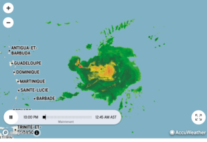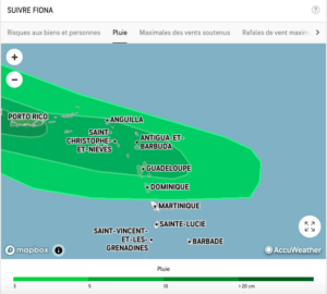 En priorité, on vous conseille le site Accuweather pour sa lisibilité et la variété du contenu. On y retrouve les principaux éléments sur les zones concernées par les pluies, les maximales de vents soutenus, ce qui peut représenter des risques aux biens et aux personnes. C’est assez visuel sans précision extrême.