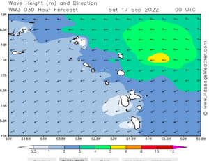 Il faut juste cliquer en arrivant sur l’interface sur la bonne zone géographique. Ensuite, il est possible de visualiser en version animée (en actionnant en bas de l’image l’animation) les hauteurs de vagues attendues mais aussi les températures et autres conditions de vent. On y voit clairement la masse de perturbations approcher avec des creux à 3mètres générés et sur le modèle de prévision choisi, le gros ne passe pas sur la Guadeloupe mais sans doute avec des effets ressentis. On imagine que ça peut évoluer dans un sens comme dans l’autre.