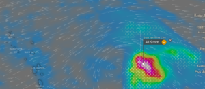 Quand on choisit les vagues comme critères, voilà le résultat et au coeur du phénomène, on constate des creux de 5 mètres. Il est également possible de suivre les accumulations de pluie à l’intérieur même du phénomène.