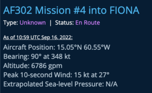Ce sont les avions de  l’Agence Américaine d’Observation océanique et Atmosphérique (NOAA). Update: Nous étions ce matin avant 7H à la 4è mission de reconnaissance à l’intérieur de Fiona.