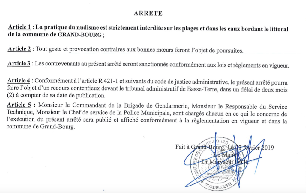 La mairie de Grand-Bourg a pris un arrêté d’interdiction du nudisme dès 2019. Ces derniers jours, il a été de nouveau affiché sur les plages de Trois-Ilets et de Folle-Anse notamment car il serait régulièrement « arraché ». La police municipale alertée de ces faits indique qu’elle passe quotidiennement depuis le début de la haute saison dans le secteur de Trois-Ilets et de Folle-Anse. Depuis le témoignage de Fabienne sur les réseaux, les passages auraient même été doublés mais rien à signaler pour le moment rapporte la police qui indique que la gendarmerie est également mobilisée. Il est à rappeler qu’en France, la pratique du naturisme (qui englobe le nudisme) est réglementée par l’Article 222-32 du Code Pénal : « l’exhibition sexuelle imposée à la vue d’autrui dans un lieu accessible aux regards du public est punie d’un an d’emprisonnement et de 15 000 euros d’amende». C’est le texte de loi que l’on retrouve sur les sites qui traitent du sujet. Le mieux à faire quand vous constatez ces faits est sans doute de signaler immédiatement à la police municipale de Grand-Bourg et à la gendarmerie. De plus , légalement vous seriez dans votre bon droit de rappeler aux personnes pratiquant le nudisme qu’elles sont dans l’illégalité d’autant plus qu’un arrêté d’interdiction est en vigueur. Ces personnes sont censées le savoir car elles doivent s’en informer quand elles souhaitent le pratiquer quelque part. En voilà plus bas un extrait à diffuser et à montrer à tout contrevenant et la version pdf disponible ici nudisme